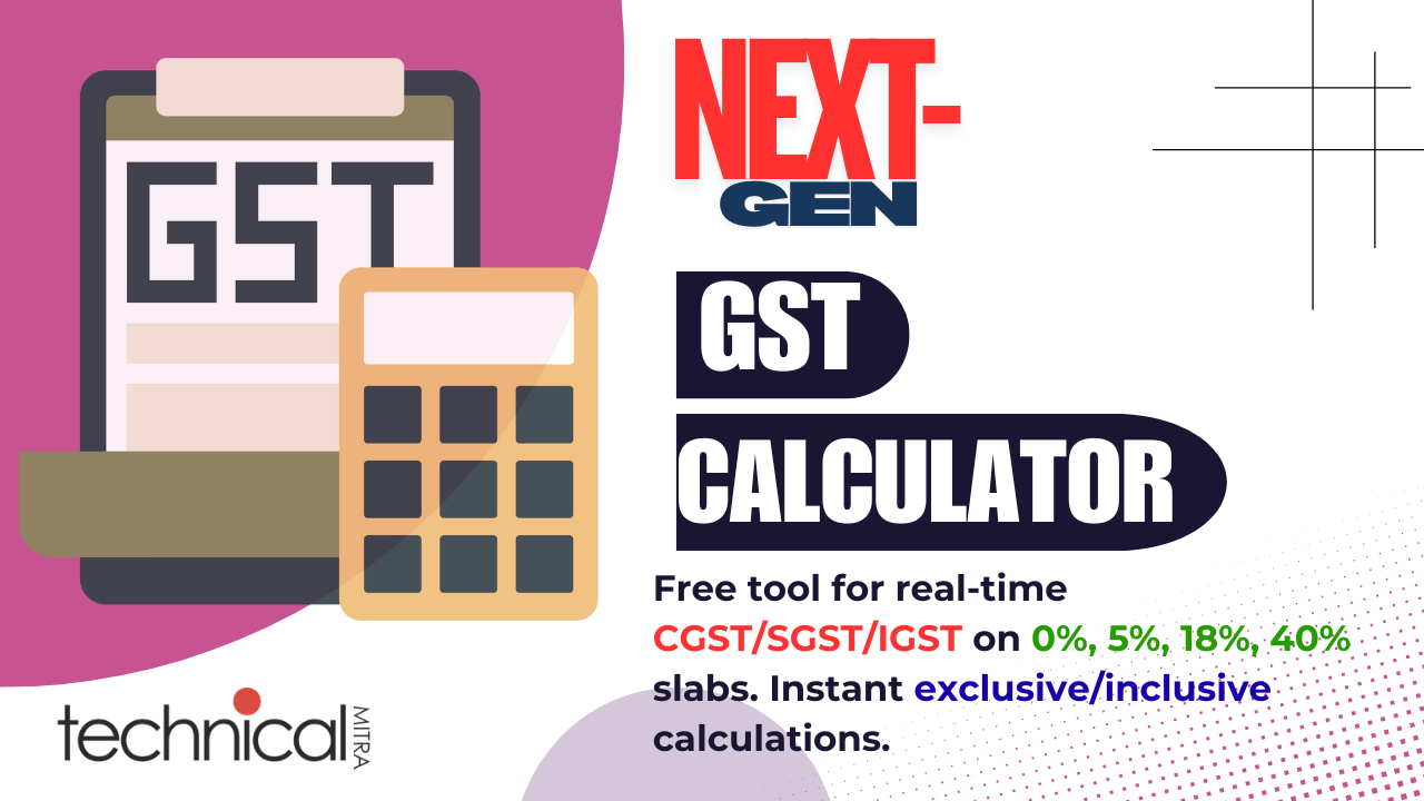 SEO Description: Master GST 2.0 with Technical Mitra Next-Gen GST Calculator: Free tool for real-time CGST/SGST/IGST on 0%, 5%, 18%, 40% slabs. Instant exclusive/inclusive calcs for Technical Mitra users. (149 chars)