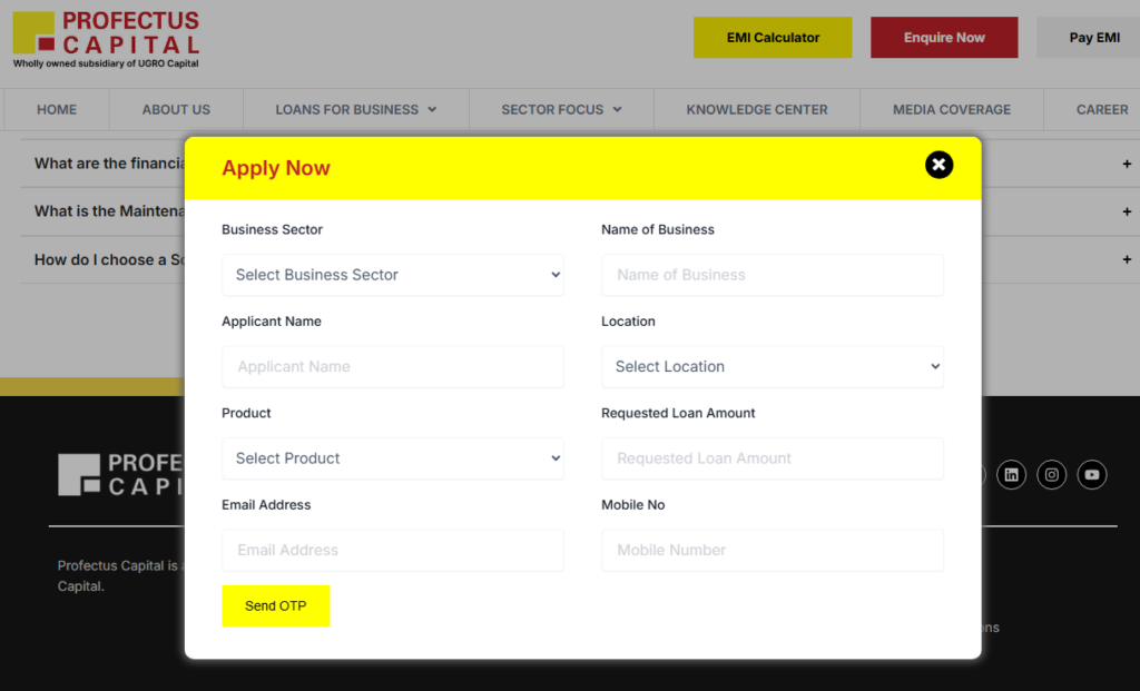प्रोफेक्टस कैपिटल की वेबसाइट पर जाएं और ‘Profectus Capital Rooftop Solar Loan Apply Now‘ फॉर्म में अपना बिजनेस सेक्टर, कंपनी का नाम और आवेदक का विवरण भरें।